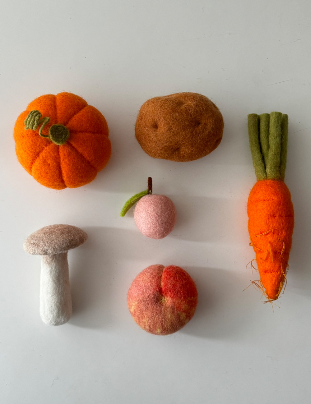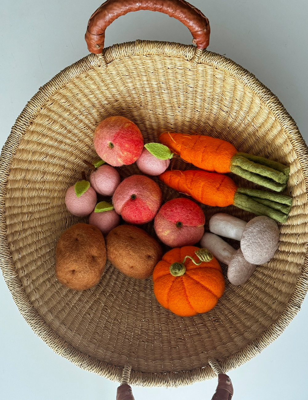 분트의 펠트 과일·야채 시리즈는 작은 손에 쏙 들어오는 사이즈와 도톰하고 부드러운 촉감, 차분한 색감으로 완성된 100% 양모 펠트 교구입니다. 장난감처럼 소리나지 않지만, 아이의 손끝과 상상력은 자연스럽게 반응하게 됩니다. 감각놀이, 소근육 발달, 역할놀이까지 하나의 교구로 유연하게 확장되는 조용한 상상력의 시작점이 되어줄 거예요.