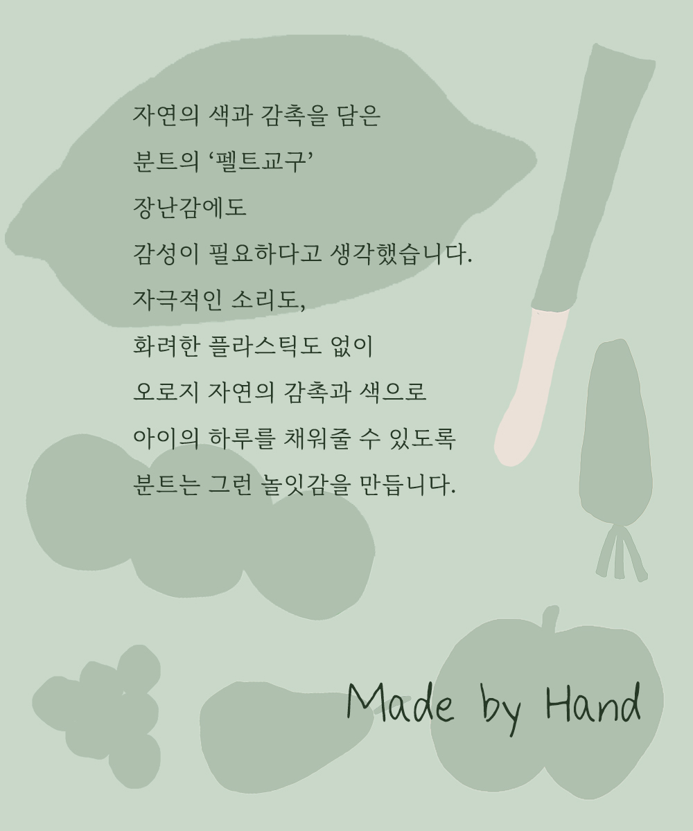 분트의 펠트 과일·야채 시리즈는 작은 손에 쏙 들어오는 사이즈와 도톰하고 부드러운 촉감, 차분한 색감으로 완성된 100% 양모 펠트 교구입니다. 장난감처럼 소리나지 않지만, 아이의 손끝과 상상력은 자연스럽게 반응하게 됩니다. 감각놀이, 소근육 발달, 역할놀이까지 하나의 교구로 유연하게 확장되는 조용한 상상력의 시작점이 되어줄 거예요.