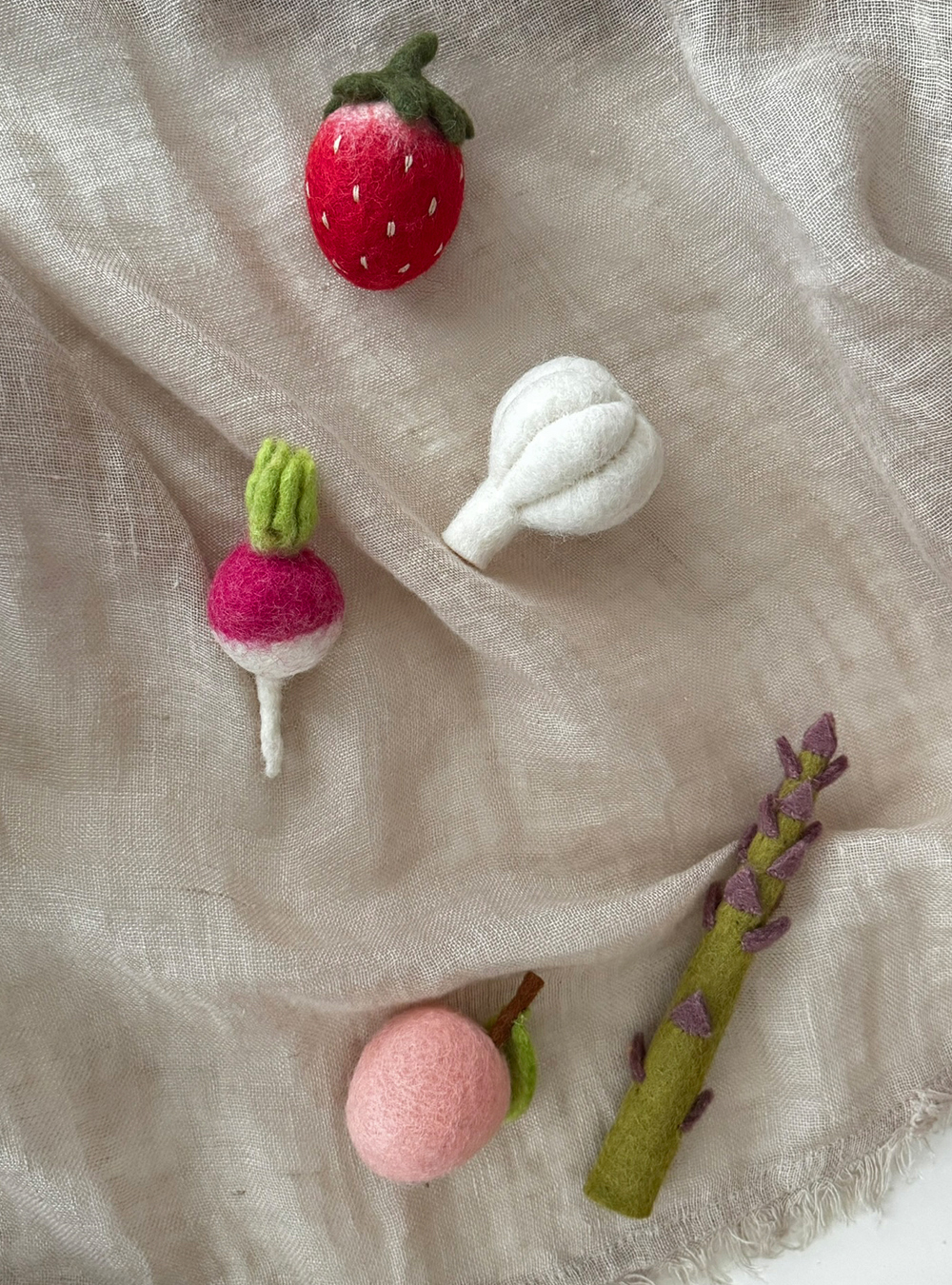 분트의 펠트 과일·야채 시리즈는 작은 손에 쏙 들어오는 사이즈와 도톰하고 부드러운 촉감, 차분한 색감으로 완성된 100% 양모 펠트 교구입니다. 장난감처럼 소리나지 않지만, 아이의 손끝과 상상력은 자연스럽게 반응하게 됩니다. 감각놀이, 소근육 발달, 역할놀이까지 하나의 교구로 유연하게 확장되는 조용한 상상력의 시작점이 되어줄 거예요.