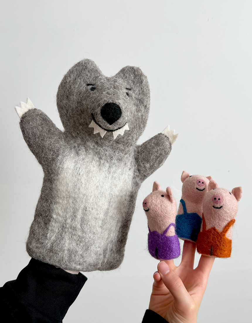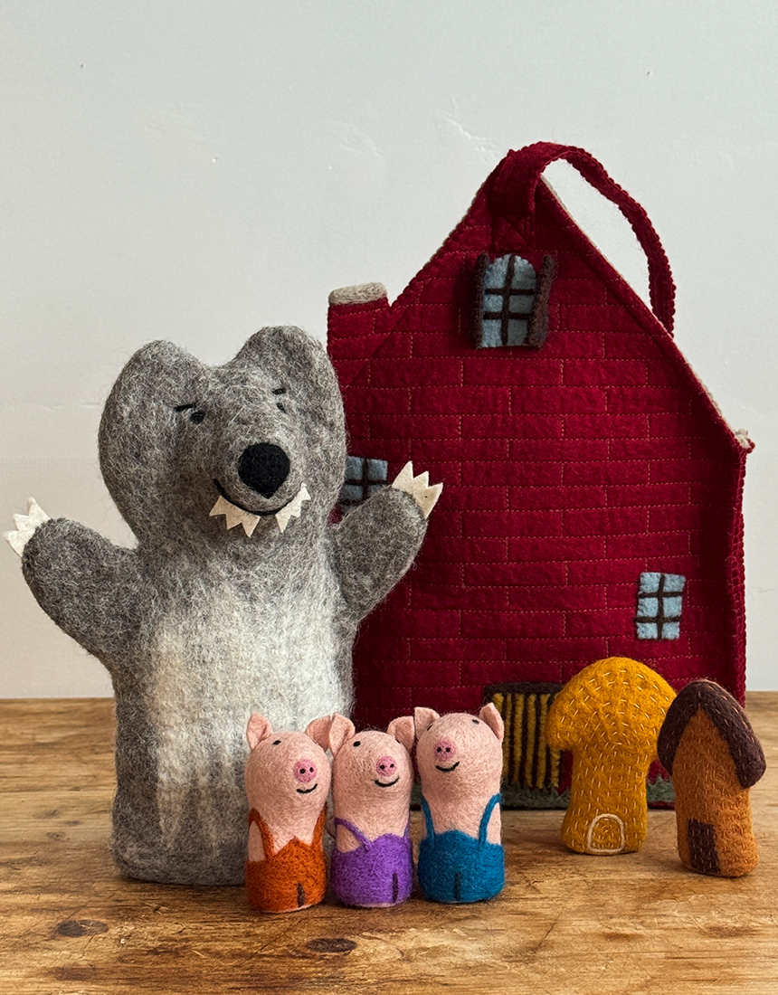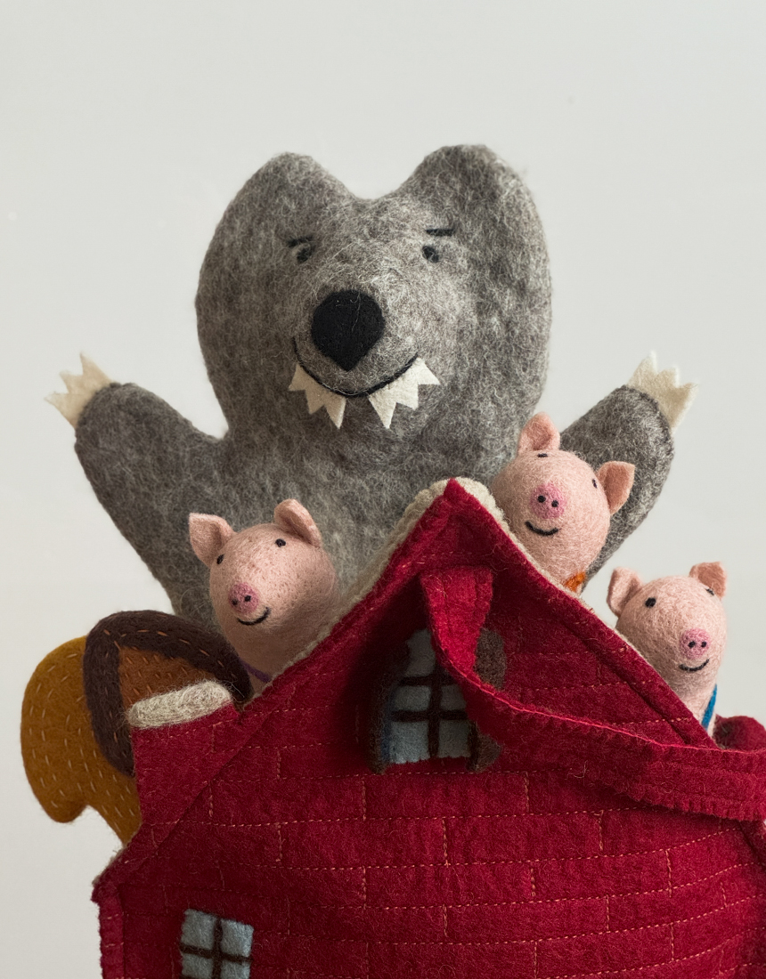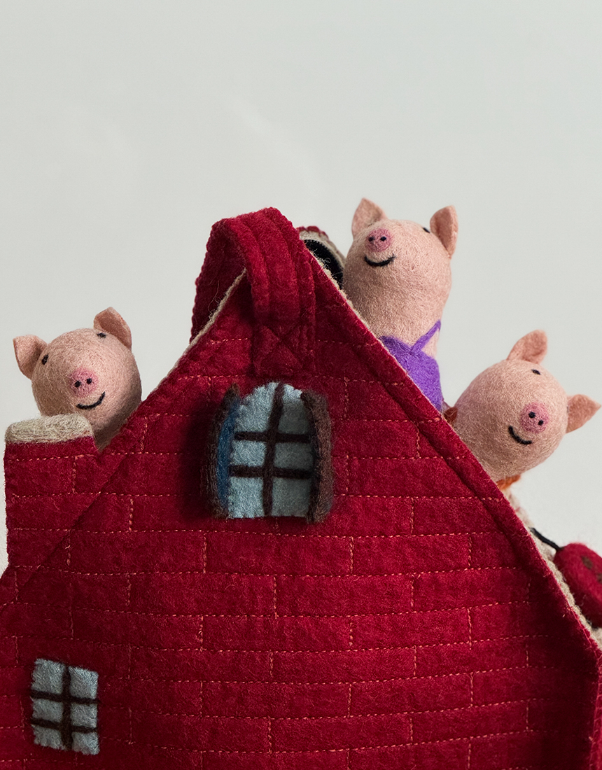 부드럽고 따뜻한 100 % 울 펠트에 AZO Free 염색을 더해 돼지 삼형제와 허당 늑대를 표현했고, 막내돼지의 튼튼한 벽돌집은 가방으로 완성시켰습니다. 모든 바느질·자수 공정은 숙련 펠트 작가가 한 땀 한 땀 직접 진행했습니다. 아이는 물론, 부모도 함께 스토리텔링·역할극을 즐기며 창의력·언어·감정 표현 능력을 동시에 키울 수 있어요.